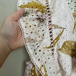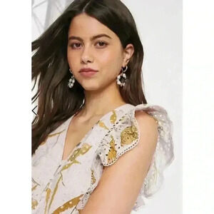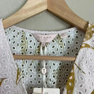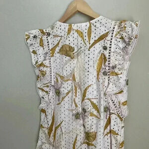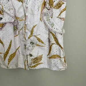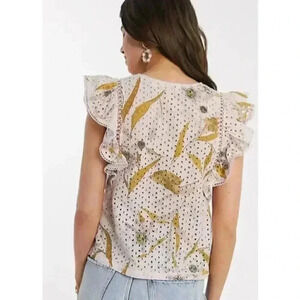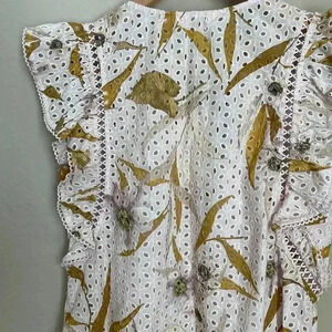 Features: A summery blouse hits all the romantic high notes in floral-printed cotton eyelet detailed with open-stitch insets and embroidery-trimmed ruffles.
