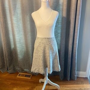 White and grey knit + tweed (Skirt: 39% Viscose, 38% Cotton, 18% Acrylic, 3% Polyamide, 1% Metallised fibers, 1% Elastane; Top: 61% Viscose, 39% Polyamide). Hourglass. Sleeveless. V-neckline. Exposed back zipper closure. Not lined. Side pockets. 36" from shoulder to hemline. Imported.