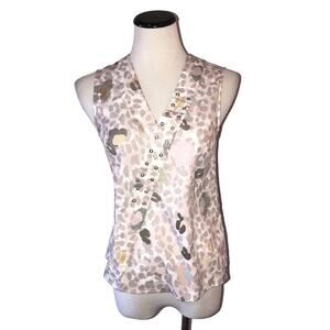 Follow your animal instinct and invest in the polished print of Ted’s ALETHE top. Its flattering silhouette features an elegant V neck and contemporary eyelet detailing, just the ticket for adding a touch of flair to your favorite pair of jeans. Sleeveless. Cheetah chic print. Polyester. Hand wash. In preowned condition.