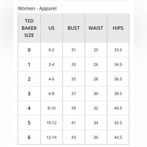Model measurements: 5'9" height, 33.5" bust, 23.5" waist, 34.5" hips, wearing a Ted Baker size 1 or US 4