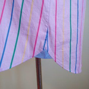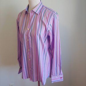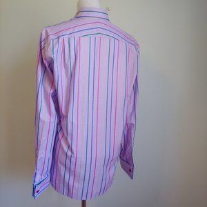 Add sophisticated flair to any ensemble with this Ted Baker London Archive 100% cotton lavender and multicolor striped French cuff button-up dress shirt. Pattern is a modern purple lavender base with yellow, green, blue and pink stripes. Interior collar sports a light blue field with white, cobalt, and navy striped pattern. Off-white front buttons with authentic ‘Archive’ side lettering (shown) and sporty dark pink / red French Cuff buttons. Legendary Ted Baker quality and style. In Ted we trust