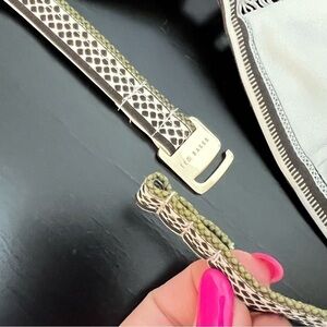 •Gold tone metal hook closure at back
