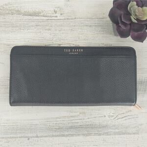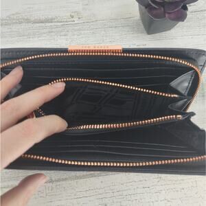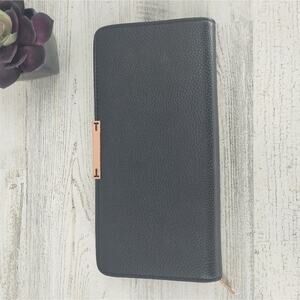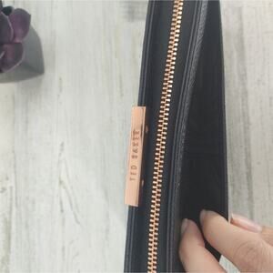 Ted Baker Black Leather Zip Around Rose Gold Accents Billfold Wallet Clutch
