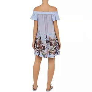 Ted Baker Belriaa Illusion Dress Swim Cover-Up blue with floral accents. Straight elasticized neckline, Off-the-shoulder short flutter sleeves, Trapeze silhouette, mini length, Floral print, semi-sheer fabric, Side slits, pullover style. In excellent condition.