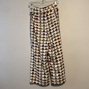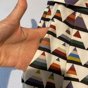 Like new condition cream polyester cropped pants with multicolored triangles. Paper bag style waist. Belt. 2 side pockets. Size 2. Waist laying flat 14”. Inseam 21”. Rise
