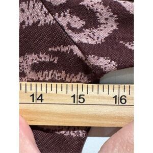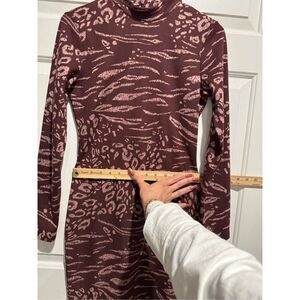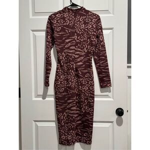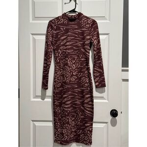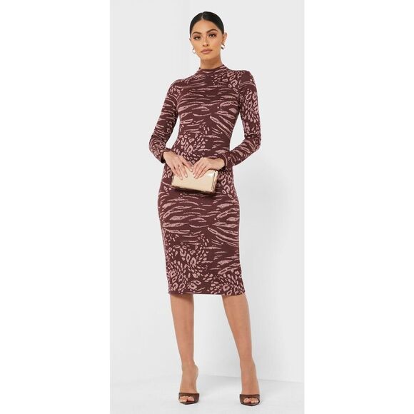 Elegant midi dress with a fitted silhouette. Features a unique pattern. Long sleeves and high neckline.