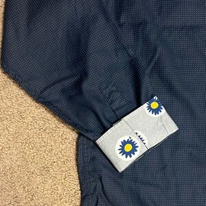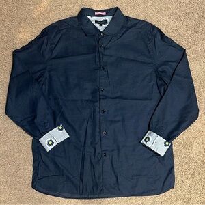 Ted Baker Button Up Dress Shirt Polkadot Floral Flip Cuff Navy Blue 6 / XXL. Ted Baker London Button Up Shirt in blue with a polk-a-dot pattern, long sleeves, and a collared neckline. Features a unique contrasting daisy pattern on the foldover flip cuff. 100% cotton. Approx measurements: 23.75“ pit to pit & 30“ length. Great pre-owned condition. No stains/flaws. Smoke/pet free home. Offers welcome. Bundle & save. Ship same/next day. Packaged w/ care.