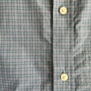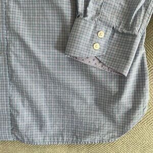100% cotton Ted Baker button up dress shirt and white blue and lavender Plaid with contrast Pattern on the placket and cuffs. Laying flat measures 31 inches from shoulder to hem and 22 inches from armpit to armpit. Size 16 32/33.