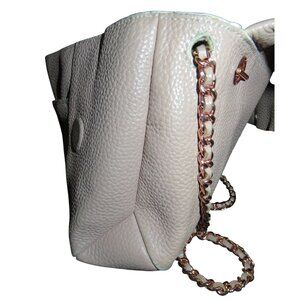 Bag is a mauve pink Italian leather with gorgeous rose gold hardware and chain which compliment each other beautifully! The 2 magnetic closure snaps are stronger than most bags I have had.