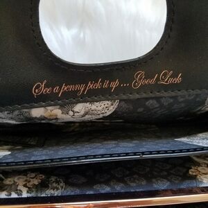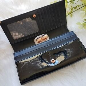 In good used condition, lettering a little faded, patent leather black, back zipper, card slots, rose gold hardware.