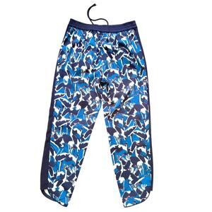 Ted Baker Colour by Numbers “Mala” Crane Print Jogger Pants in blue/black/white, size [insert size]. Features bold crane bird print, elastic waistband with drawstring, side stripe detail, and relaxed tapered leg. From Ted Baker’s limited Colour by Numbers line, known for collectible prints and playful design.