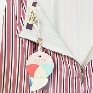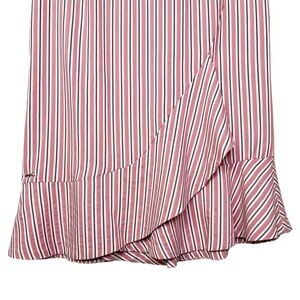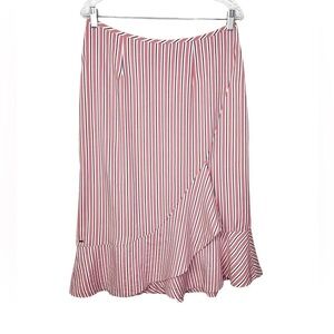 Ted Baker Coryn Skirt. In the color pink, a pink and white stripe. Asymmetrical ruffle hem. Back zip closure.