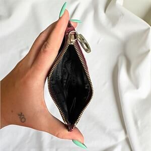 Burgundy Ted Baker card holder with a croc-embossed finish and gold zip. Has a keyring attached, perfect for keeping cards and a few small things together. Pre-owned but still in great shape.