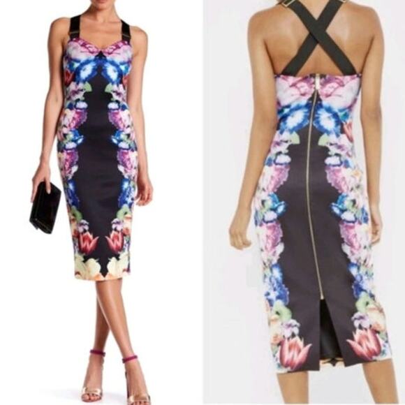 Ted Baker Deony Colorful Floral Bodycon Scuba Midi Dress US 6 Buckle Strap