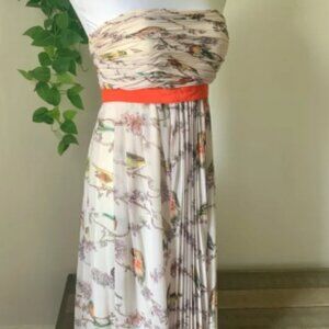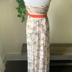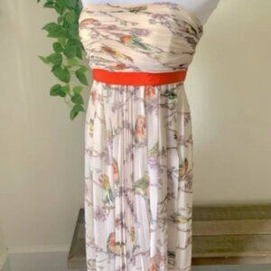 Gorgeous chiffon, empire waist maxi dress. Bird motif. Excellent condition. Strapless but convertible to halter also.
