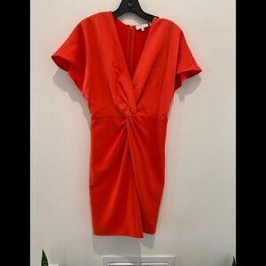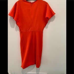 Get a sophisticated two-piece look in one dress with a flutter-sleeve bodice and slim skirt creating a beautifully balanced silhouette. The elegant twist at the front has a waist-sculpting effect. Hidden back-zip closure Surplice V-neck Short dolman sleeves Skirt is lined Back slit Lined 92% polyester, 8% elastane CONDITION Excellent. No flaws.