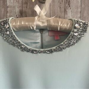 This elegant mint green dress features a stunning embellished neckline, perfect for any special occasion. Its sleek design offers a flattering fit, making it a must-have addition to your wardrobe.