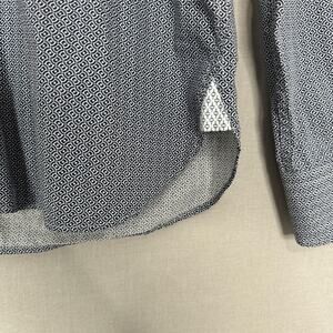 Features a blue and white micro-geometric pattern throughout. Inside collar and cuffs have a contrasting geometric print detail for added style. Slim fit silhouette for a modern tailored look.