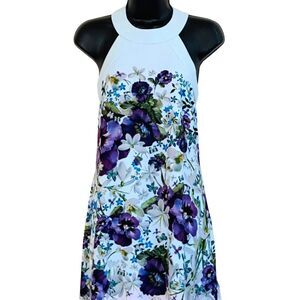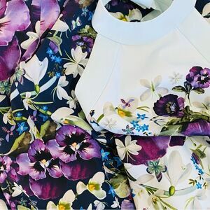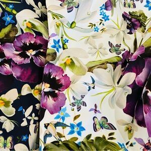 Gorgeous floral print with purple pansies, clematis, lily of the valley & butterflies. The top part of the dress is the palest light blue (refer to photo with size label for closest color match)