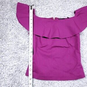 Women's Ted Baker London Perui Frill Detail Bardot Top in purple with ruffle neckline. NWT but has slight fading on the front as shown in photos. Size 0 in Ted sizing, equal to US women's size 2. Please see Ted Baker size chart attached for details. Real measurements shown in photos with top laid flat: