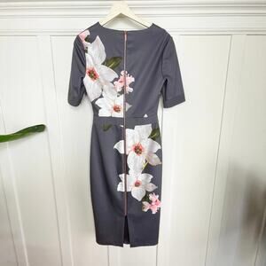 This elegant sheath dress by Ted Baker showcases an asymmetrical design with intricate embellishments and cut-out details. The sophisticated gray and white color palette makes it an ideal choice for a wedding guest or cocktail event. Featuring a crew neck and 3/4 sleeves, this midi dress offers a chic and modern style.