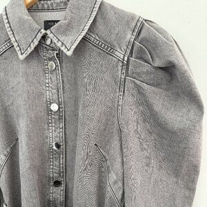 Stylish gray denim midi dress. Features button-down front. Includes a matching belt. Perfect for casual outings.
