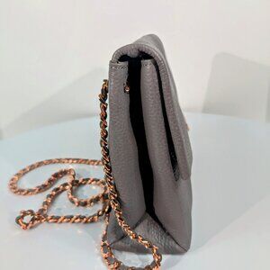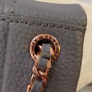 This elegant Ted Baker London handbag is made from soft, pebbled leather grey mauve/taupe purple hue. The bag features a classic flap-over design that secures with a magnetic snap closure. A prominent design element is the polished rose gold-toned metallic bar centrally placed on the flap, delicately engraved with the "TED BAKER LONDON" logo, adding a signature touch. The bag is carried by a rose gold-toned chainn and leather-interwoven strap. The interior is well-organized, featuring multiple compartments and pockets (as suggested by the structure and a glimpse into the lining), with a suede lining that is characteristic of Ted Baker's attention to detail. The overall design balances classic elegance with contemporary rose gold hardware, making it suitable for both casual and more dressed-up occasions.