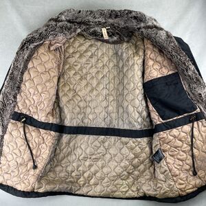 Color: Black exterior; taupe quilted lining; gray faux fur at collar/upper lining