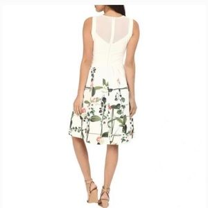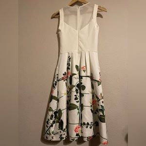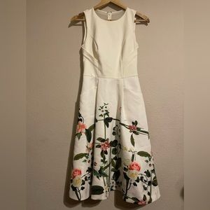 Beautiful photo-realistic floral fauna skirt that pops against a solid background featured at bodice.