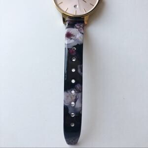 Ted Baker Kate watch new in box, gold plated silver dial, round face, full leather strap with dark floral pattern, gold tone case, quartz movement, tonal bezel, gold tone markings on rose gold face, date window, 3 hands. Floral printed patent strap, genuine leather, adjustable strap. 33mm case diameter, 13mm strap width, stainless steel case. New in box with tags