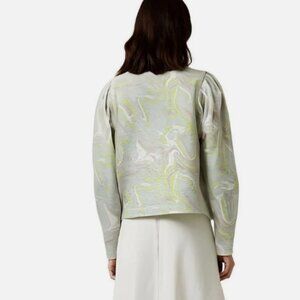 Brand new with tags, this Ted Baker LLANAA sweater features a striking green marble print and voluminous puffed sleeves for a sculptural, modern silhouette. Crafted from soft jersey with a crew neckline, it blends statement style with everyday comfort.