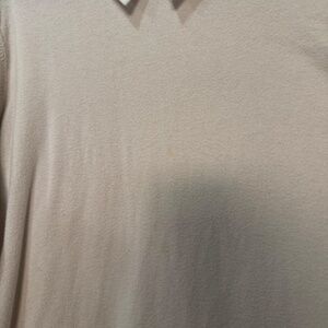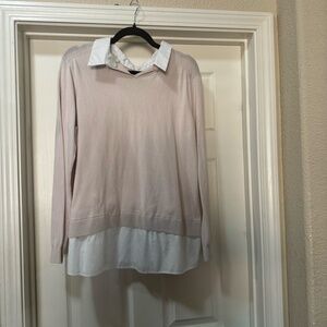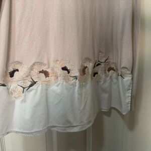 Light pink worn sweater with embroidered flowers on hem. Missing a button on the neck, small slight stain in front. See pictures.