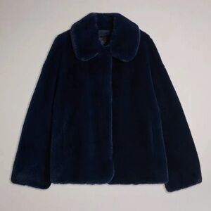 Stay warm and stylish with this elegant navy faux fur jacket. Perfect for any occasion, this jacket offers both comfort and sophistication.