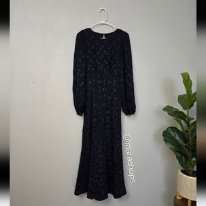 Midi length, long balloon sleeves, round neck, jacquard, polka dot pattern, tied cuffs, empire waist, matching tie waist belt, elasticated waistband at back, buttoned keyhole at back