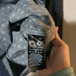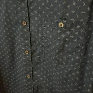 Ted Baker London 100% Cotton button down shirt. Size 5. Left chest pocket. Unique pattern inside neckline and cuffs. 7 buttons down the front. Navy blue with a classy pattern.
