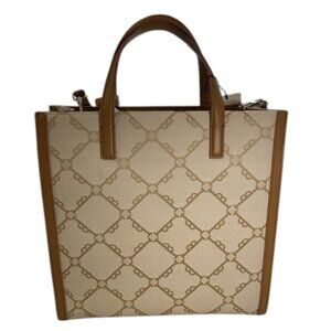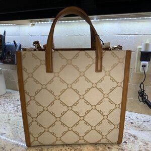 This tote bag is big enough for your laptop, your water bottle and all your necessary items! Step out in a beautiful bag that is perfect for Spring / Summer with camel color leather trim. Goldtone hardware. Lots of pockets inside along with a zippered pocket. Canvas and tan leather detailing. Brand new, never used. Nice large size, measuring 13" tall + 5" drop handles, 13.5" wide and 4.75" deep. Currently retails on Amazon for $250. The purse in the pictures 1-15 is the purse you will receive. Last picture for display only. Crossbody strap is wide enough to be comfortable, is removable and adjustable.