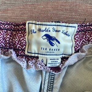 Stylish blue swim trunks with intricate pattern. Comfortable fit. Ideal for beach or pool.
