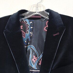 Elevate your style with this sophisticated Ted Baker London dark blue velvet blazer. Crafted from 100% cotton velvet with a plush, soft feel, this jacket features a striking patterned satin lining with paisley and geometric accents in pink, blue, and white. Single-breasted with one front button closure, notch lapel with contrast stitching, and three-button cuffs. Perfect for formal events, holiday parties, or dressing up a smart-casual look.