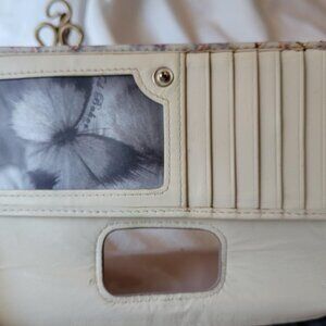 Charming wallet with bow pattern. Features a unique dog clasp. Stylish and functional.