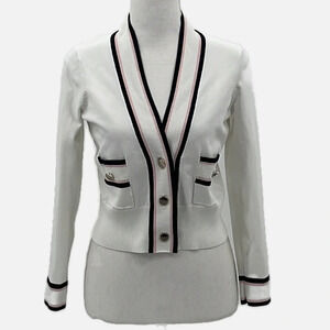 Ted Baker London Flooraa Crop Cardigan in White - Size 2 (US) 0 (Ted Size). Excellent pre-owned condition. Some of the buttons still have the protective covering on them. Crisp contrasting lines and gleaming goldtone buttons elevate the attitude of a preppy-chic cardigan that will have you looking sharp and polished. Approximate measurements: 17" pit to pit, 18" length.