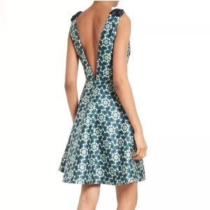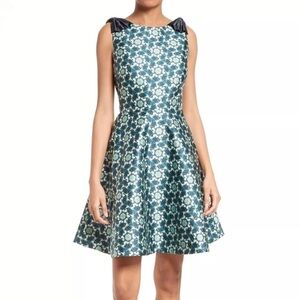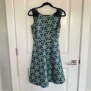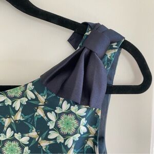 Gorgeous kaleidoscope swallow print jacquard dress by designer Ted Baker. Bow detail on shoulders. Low back. Pockets
