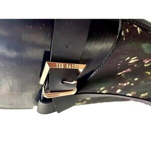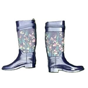 NWOT: Stylish, "Hampto" navy blue rain/wellington tall boots with beautiful watercolor floral design / rose gold hardware / etched logos / strap buckle accent / round toe / waterproof / pull on / knee high / low block heel by Ted Baker London.