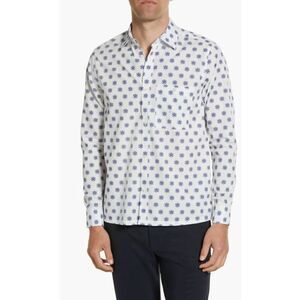 Elevate your wardrobe with this Ted Baker Ilenka shirt. Featuring a white floral geometric print and made of high-quality cotton material, this button-up shirt is perfect for any casual occasion. With a slim fit and spread collar style, it offers a modern and stylish look. Long sleeves and button closure add to its sophistication, while the accents of buttons make it stand out from other shirts. This shirt is machine washable, making it easy to care for.