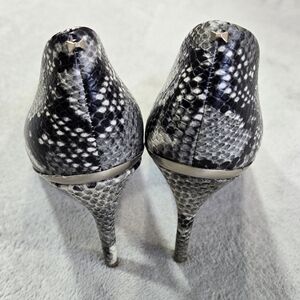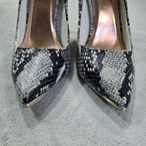 Good used condition. Black and grey pumps with an embossed snakeskin design. Pointed toe. Has metal accents which add interest.