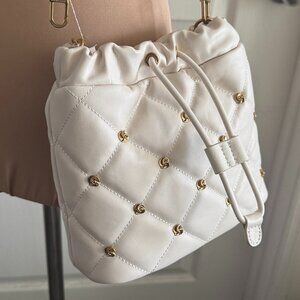 Gleaming floral studs add drama to a quilted crossbody bag topped with a drawstring closure.