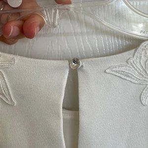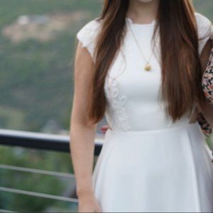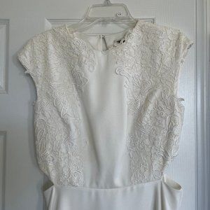 I wore this spectacular dress to my rehearsal dinner and am ready to pass it on! Spectacular midi length Ted Baker bright white dress with detailed lace applique and side cutouts. Great stretchy fabric that doesn't wrinkle easily. It has lots of beautiful details, like the sparkly button closure in the back. The first two photos are stock photos I found online, and the rest I took. You can see a photo of me wearing it—it's a Ted size 3 which is about the same as a US 8.