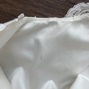 It has been dry cleaned and is in fantastic shape but there are a few imperfections. The tag is drawn on in sharpie (I think maybe I bought a sample? I honestly don't remember) and there are some faint marks on the interior lining (not visible when worn). On the back of the dress, there are also some extremely tiny dark smudges on the fabric (last photo, and they are may be hard to see because they are so tiny) that I think are from hanging this in my closet against other clothes without a garment bag. There is an extra diamond-shaped button attached to the garment tag.
