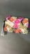 Bright floral wristlet clutch with a vibrant design. Features pink, orange, and green accents on a black background.