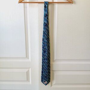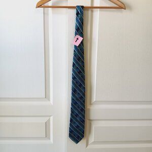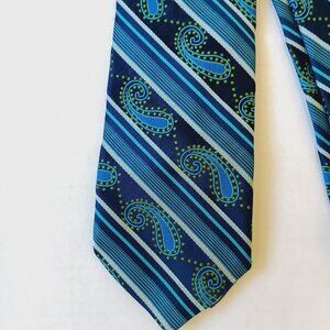 Very good pre-owned condition. Navy blue background with diagonal stripes, of various widths, and paisley pattern in various shades of blue.