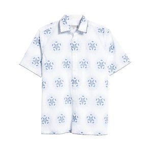 Premium casual shirt featuring a retro fogged floral print design accented by an embroidered pattern edging at the collar, cuffs and hemline